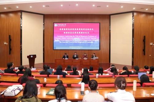 On the afternoon of November 24, Guangxi Minzu University (GXMZU) held an honorary professor appointment ceremony at the Lecture Hall on the second floor of the Library, Siyuanhu Campus. H.E. Phann Vanrath, Deputy Prosecutor General of the Supreme Court Prosecutor’s Office of Cambodia, was appointed as Honorary Professor. Wei Shizhen, President of GXMZU, attended the ceremony and presented the appointment letter to H.E. Phann Vanrath. The ceremony was hosted by Deng Guobin, Deputy Secretary of the Party Committee and Dean of the China-ASEAN Law School of GXMZU.
