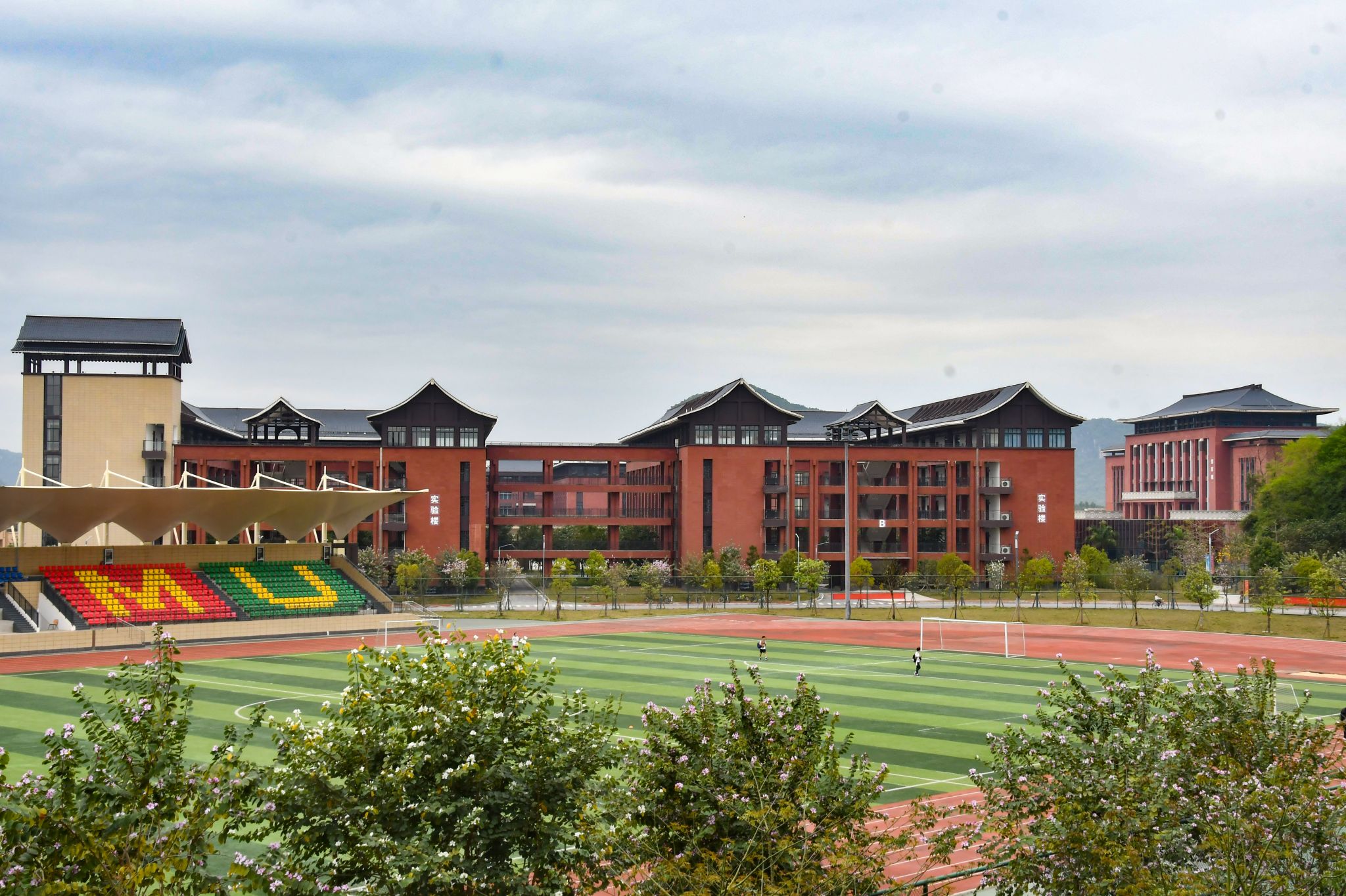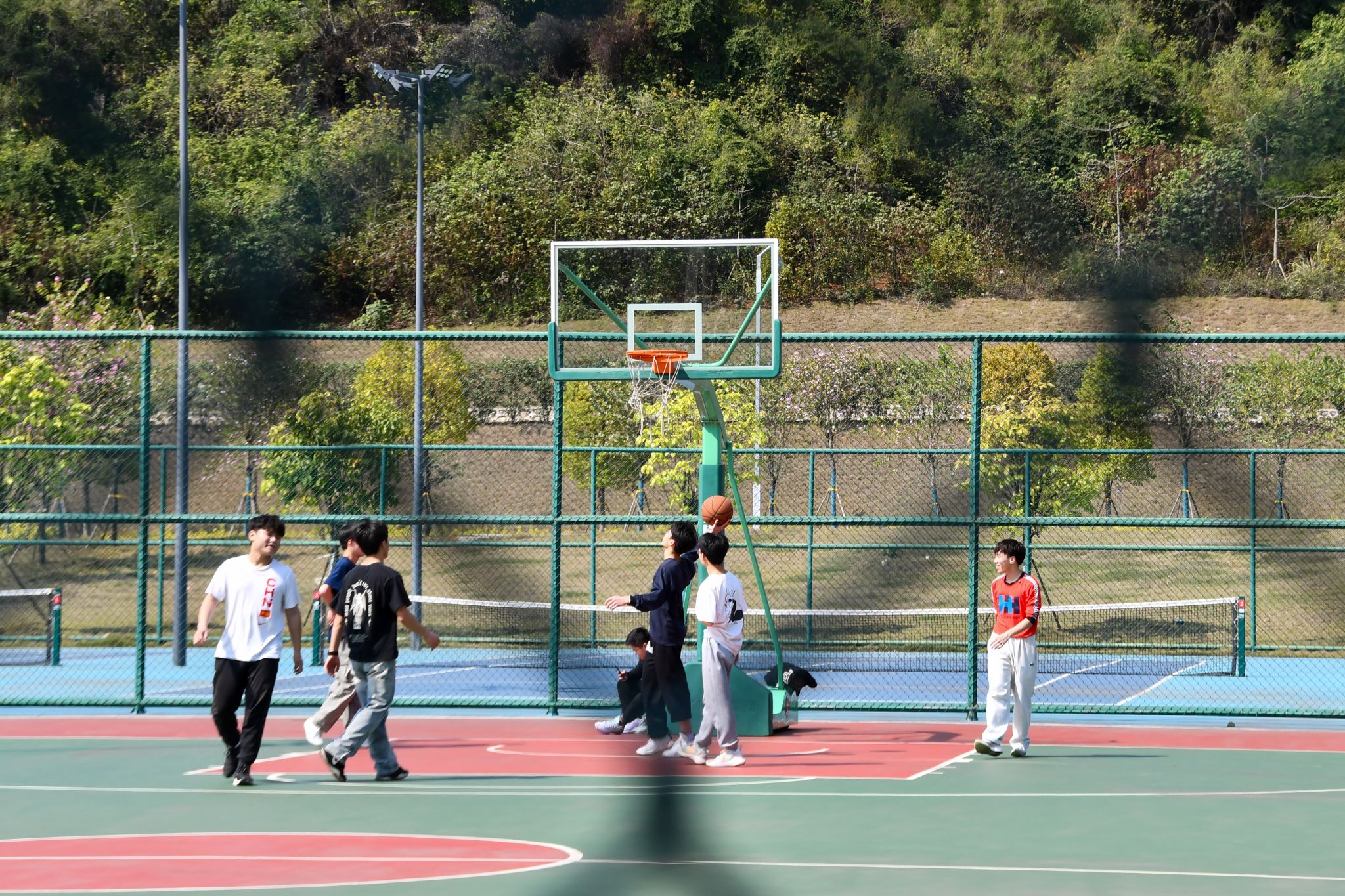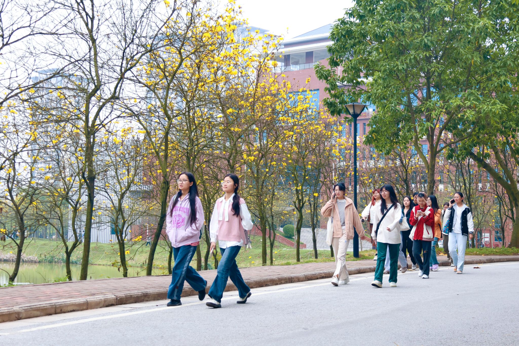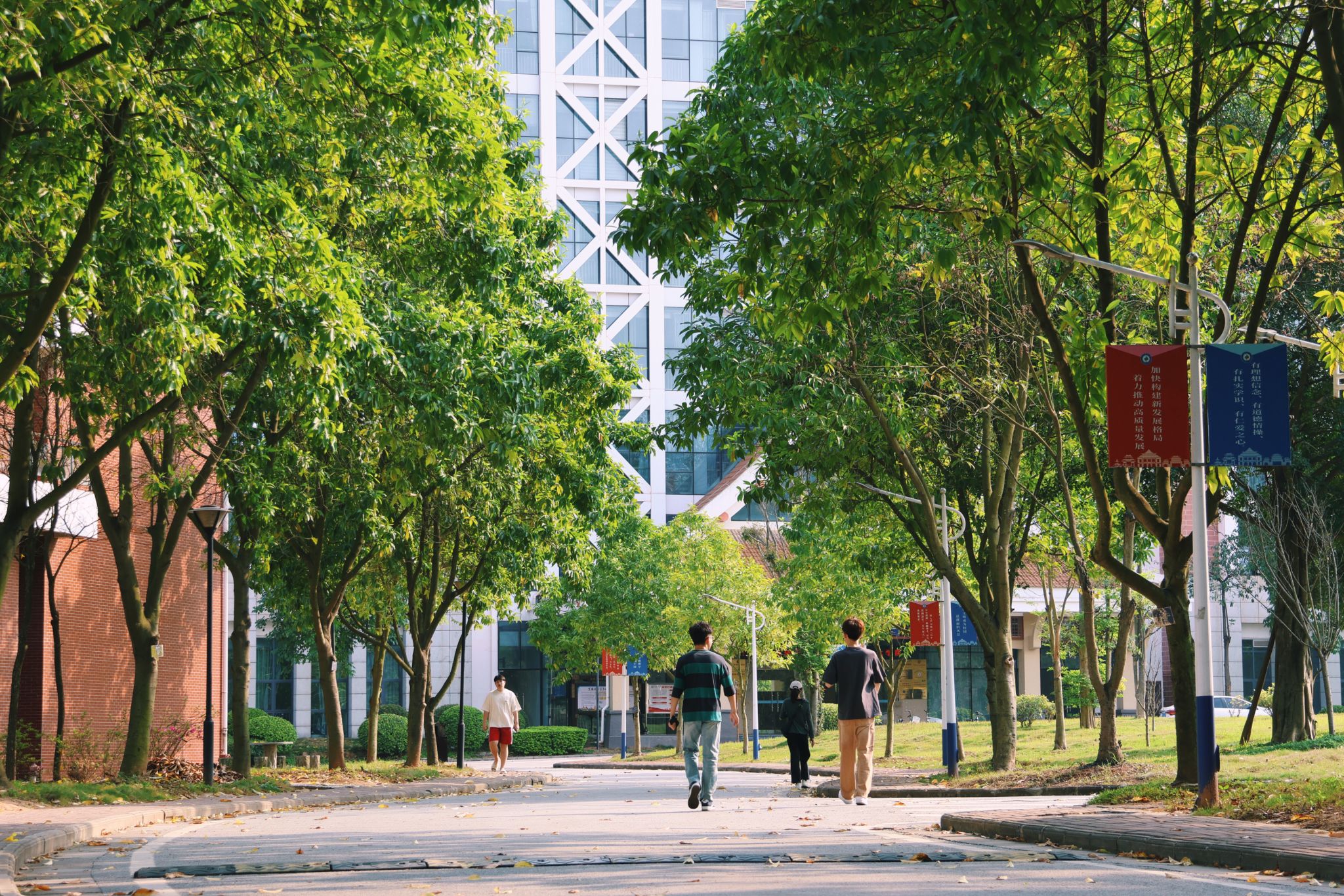微风拂面,学子穿梭在树荫下