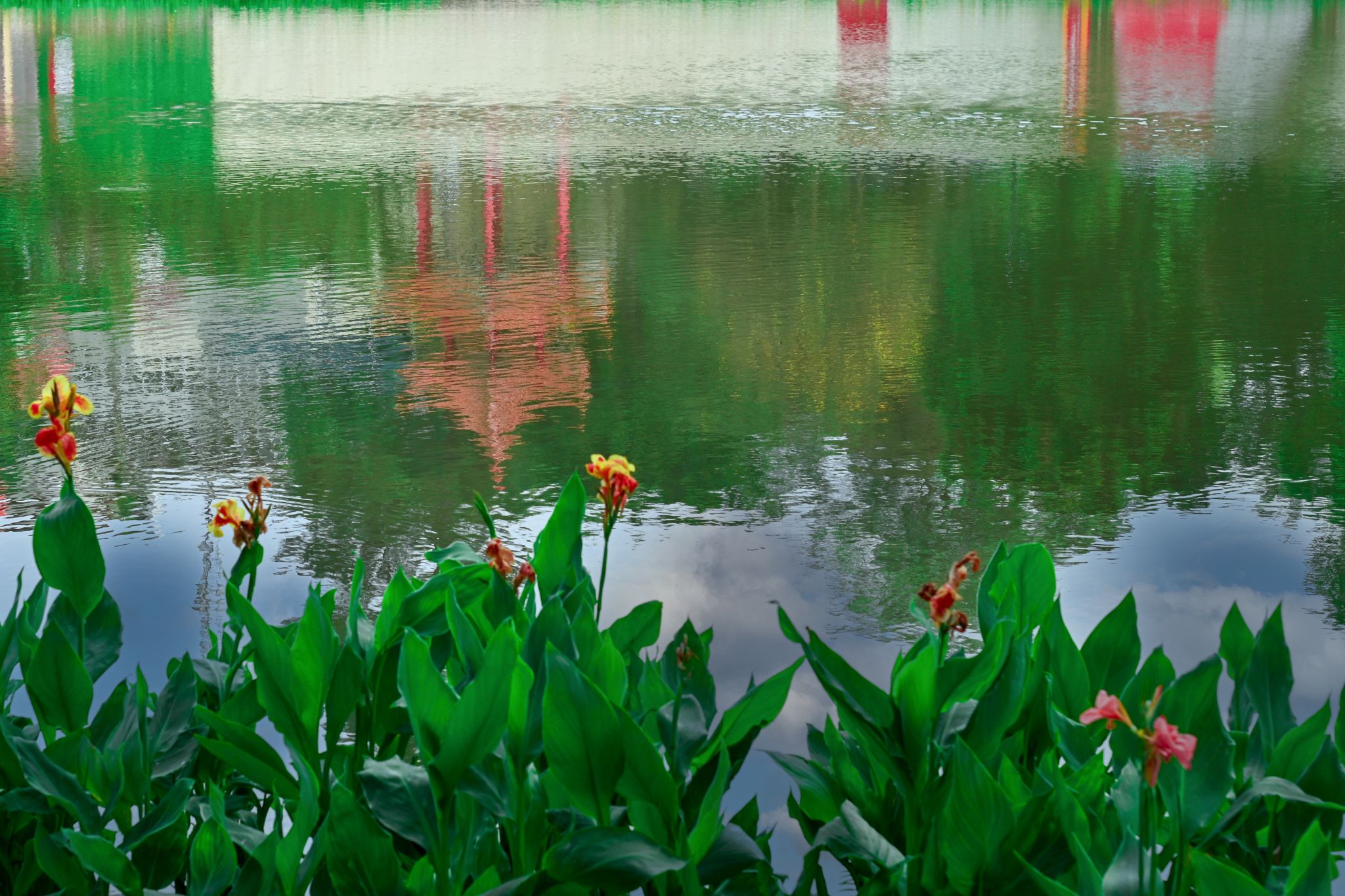 蓝天白云映翠湖,觉哉亭影入花丛